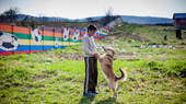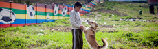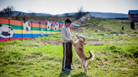 Teenager Dusan is playing with his dog Bielku beside the wall.